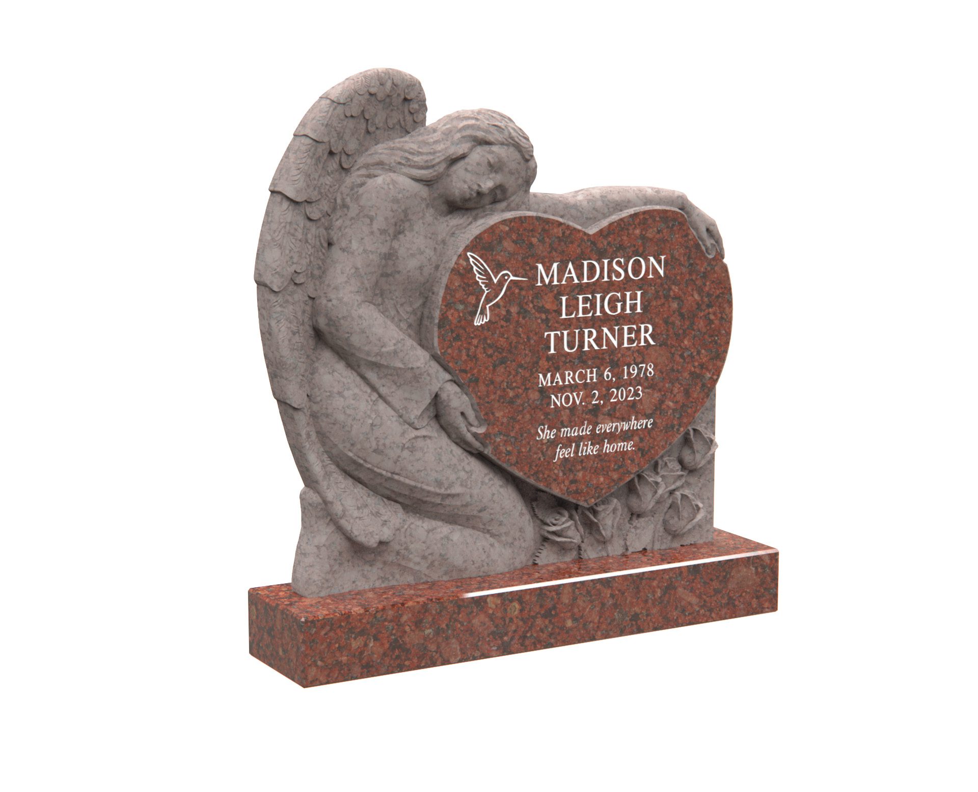 This heartfelt angel memorial portrays an angel tenderly holding a granite heart, symbolizing comfort and eternal care. Adorned with roses and a hummingbird, it represents love, peace, and the beauty of everlasting remembrance. A poetic design to honor a life forever cherished.