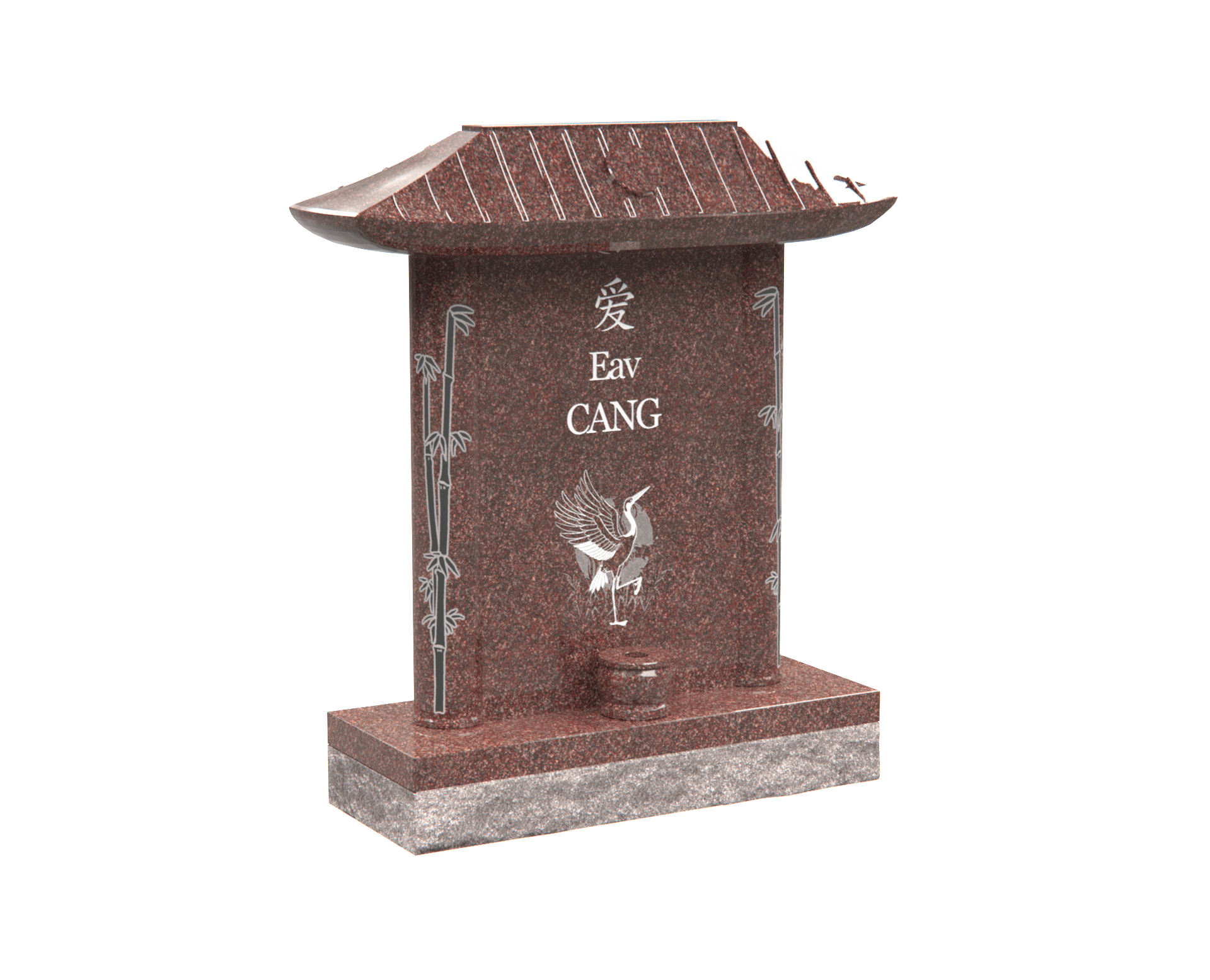 Unique granite memorial with an oriental pagoda-style roof, graceful bamboo carvings, and a soaring crane. A poetic design symbolizing love, peace, and eternal harmony.