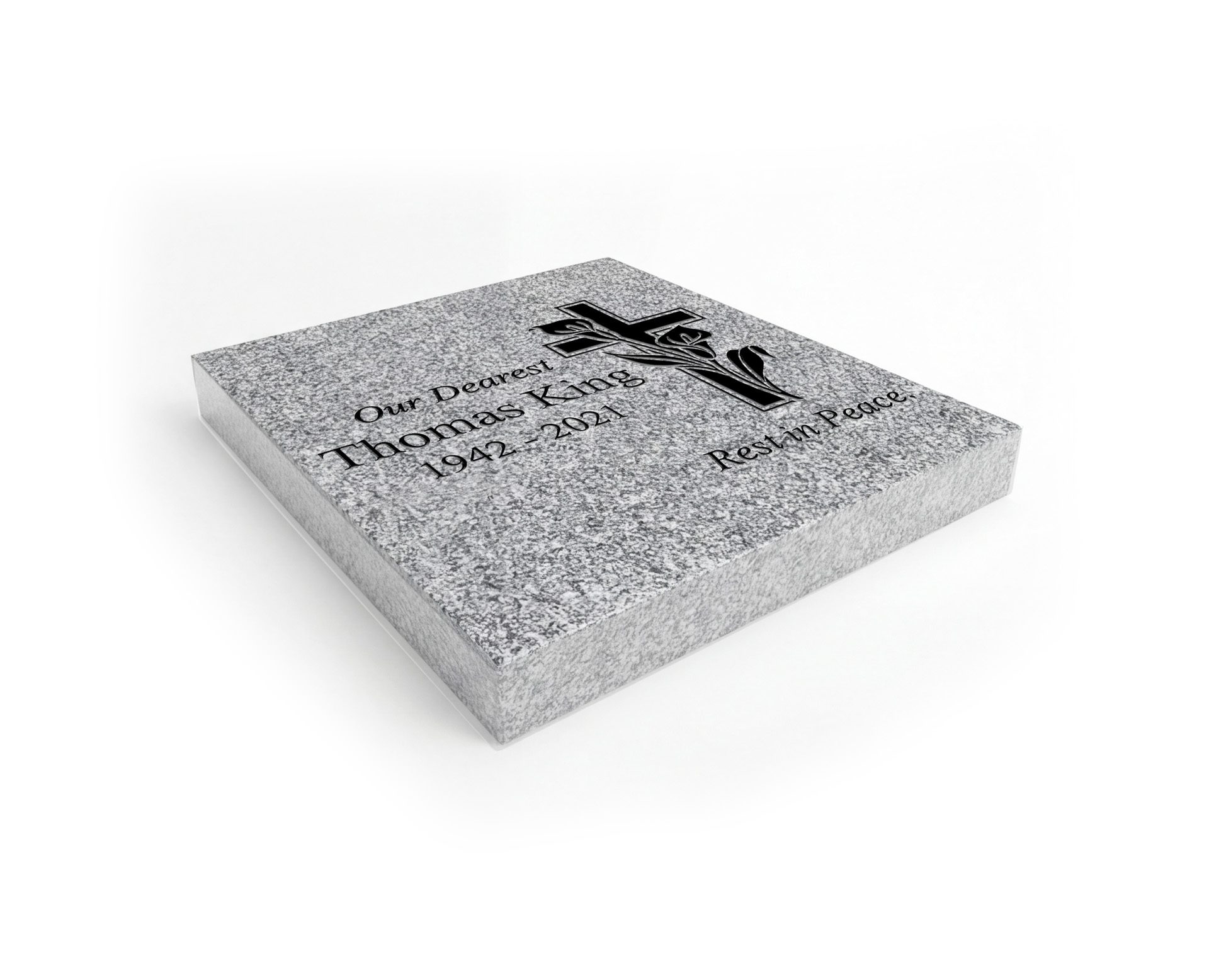 This flat granite grave marker features a simple Christian cross with a gentle floral accent, offering a clean, traditional memorial for a loved one. The polished top is engraved for clear, long-lasting names, dates, and a short message. Designed as an affordable yet respectful flat granite marker, it provides durable craftsmanship and a low-profile style that fits most cemetery requirements. Families can personalize this flat granite memorial to reflect faith, love, and lasting remembrance.