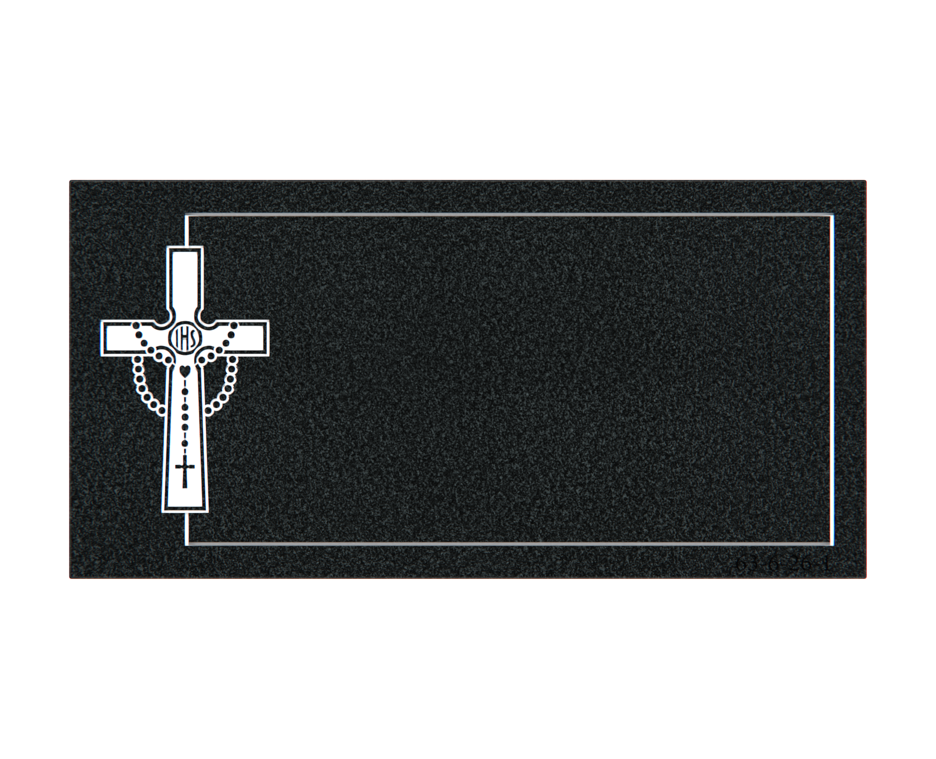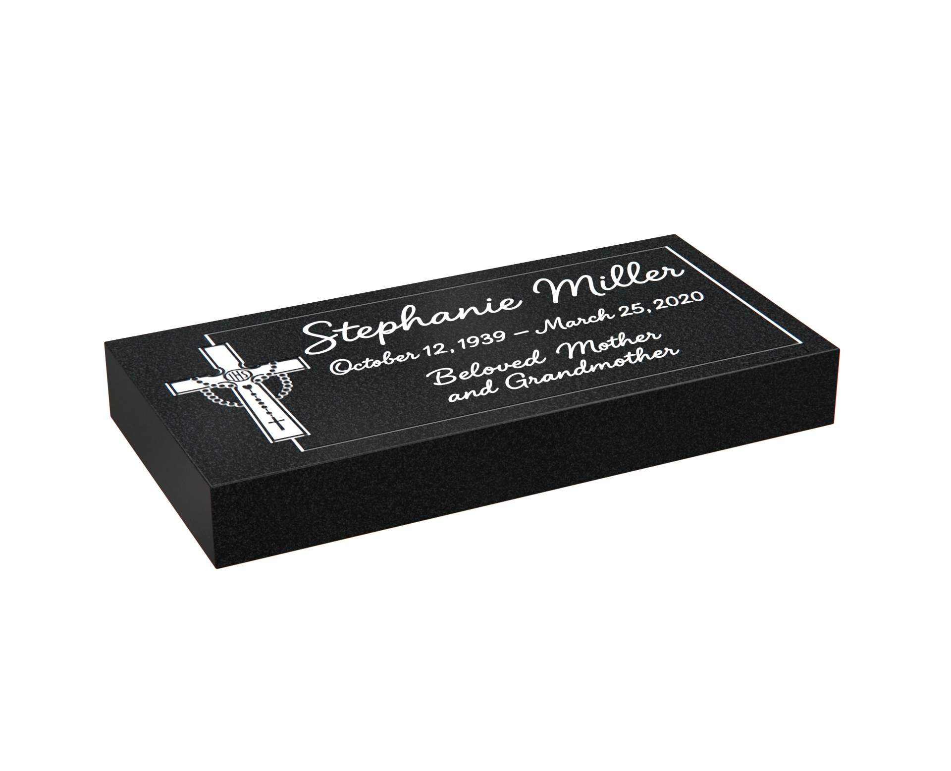 A classic flat granite memorial adorned with a cross and rosary, enhanced by elegant script engraving. A poetic design embodying grace, serenity, and eternal devotion.