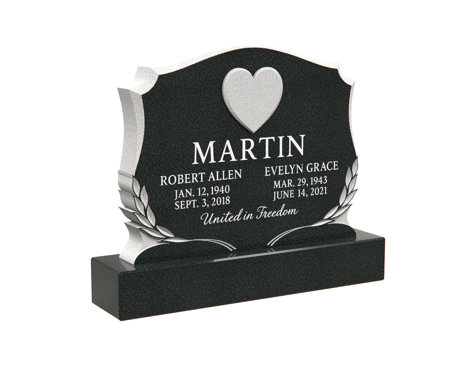 This elegant granite memorial headstone features a polished shield-shaped design adorned with a carved heart at the center, symbolizing love and remembrance. The laurel leaves on both sides represent honor and eternal peace, making it a heartfelt tribute to a cherished loved one.