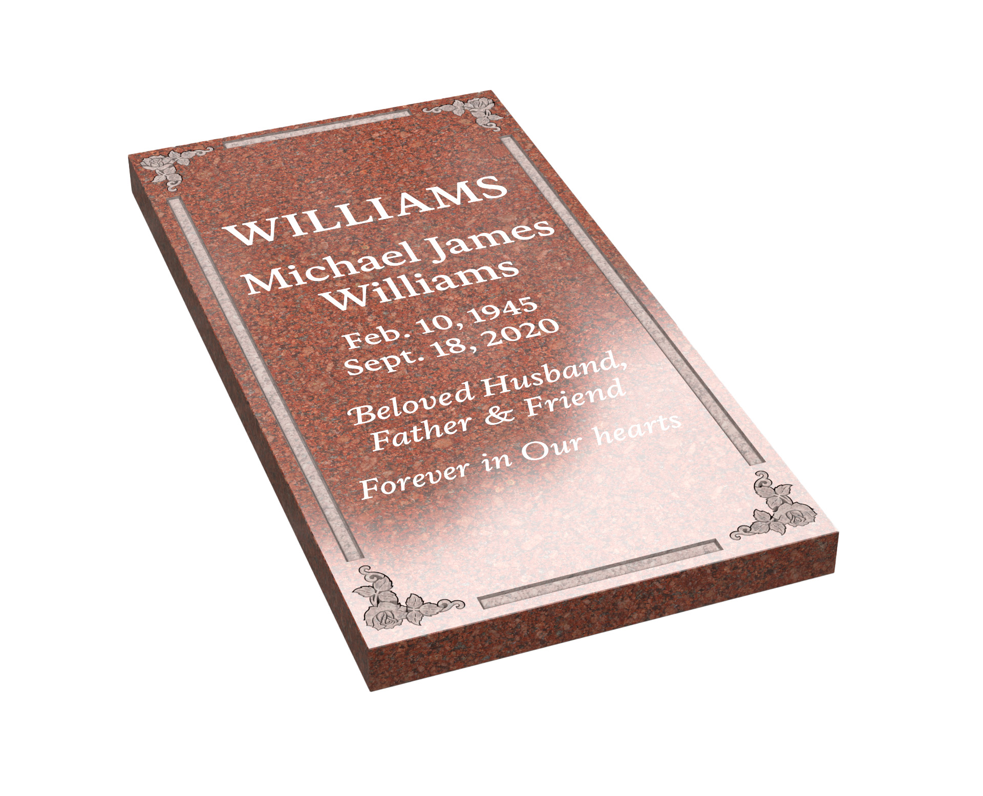 Low-profile granite ledger plaque that spans the gravesite, offering a wide polished area for names, dates, and custom wording. Decorative border and floral accents add a graceful, timeless touch.