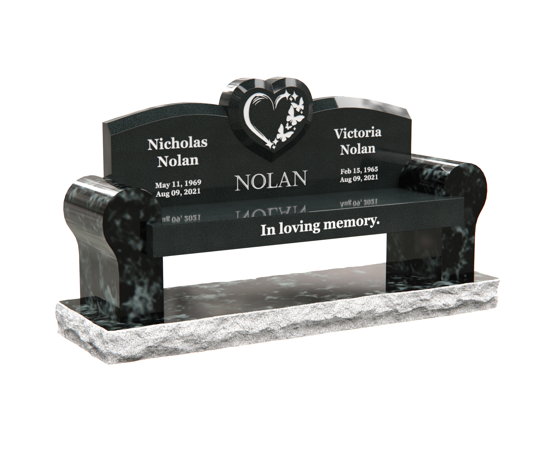Thoughtfully crafted cemetery bench monument featuring a heart-shaped centerpiece and separate inscription areas for two loved ones. This granite bench invites visitors to pause, remember, and feel connected in a quiet, meaningful way.