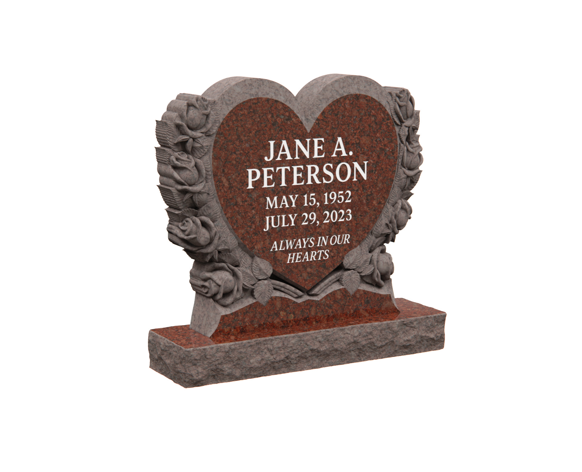 This elegant heart-shaped granite memorial is surrounded by beautifully carved roses, symbolizing eternal love and remembrance. The polished surface provides space for heartfelt inscriptions, while the side vases offer a place for fresh flowers, creating a warm and lasting tribute. A graceful design that speaks of love, devotion, and cherished memories forever held in the heart.