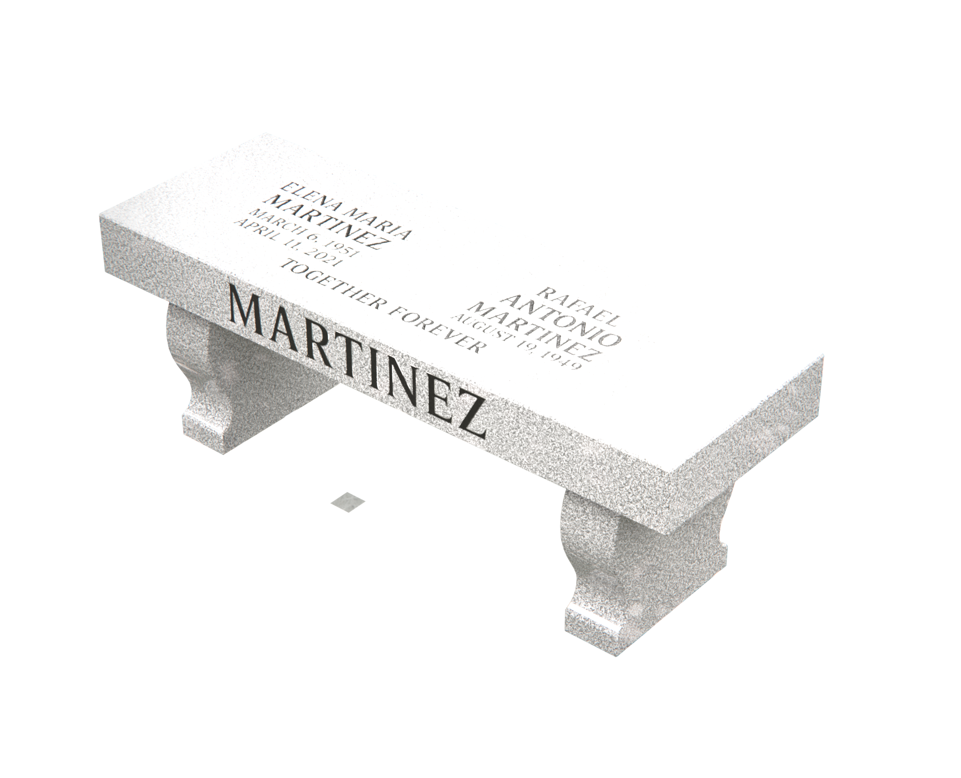 This companion granite memorial bench serves as both a monument and a place to sit and remember. The polished bench seat is engraved with two individual names, dates, and an epitaph, while the family surname is prominently featured on the side of the base for clear identification in the cemetery. With its simple rectangular top and classic pedestal legs, this granite bench monument is ideal for family plots, garden memorials, and cemetery bench installations where loved ones can pause, reflect, and honor cherished memories.