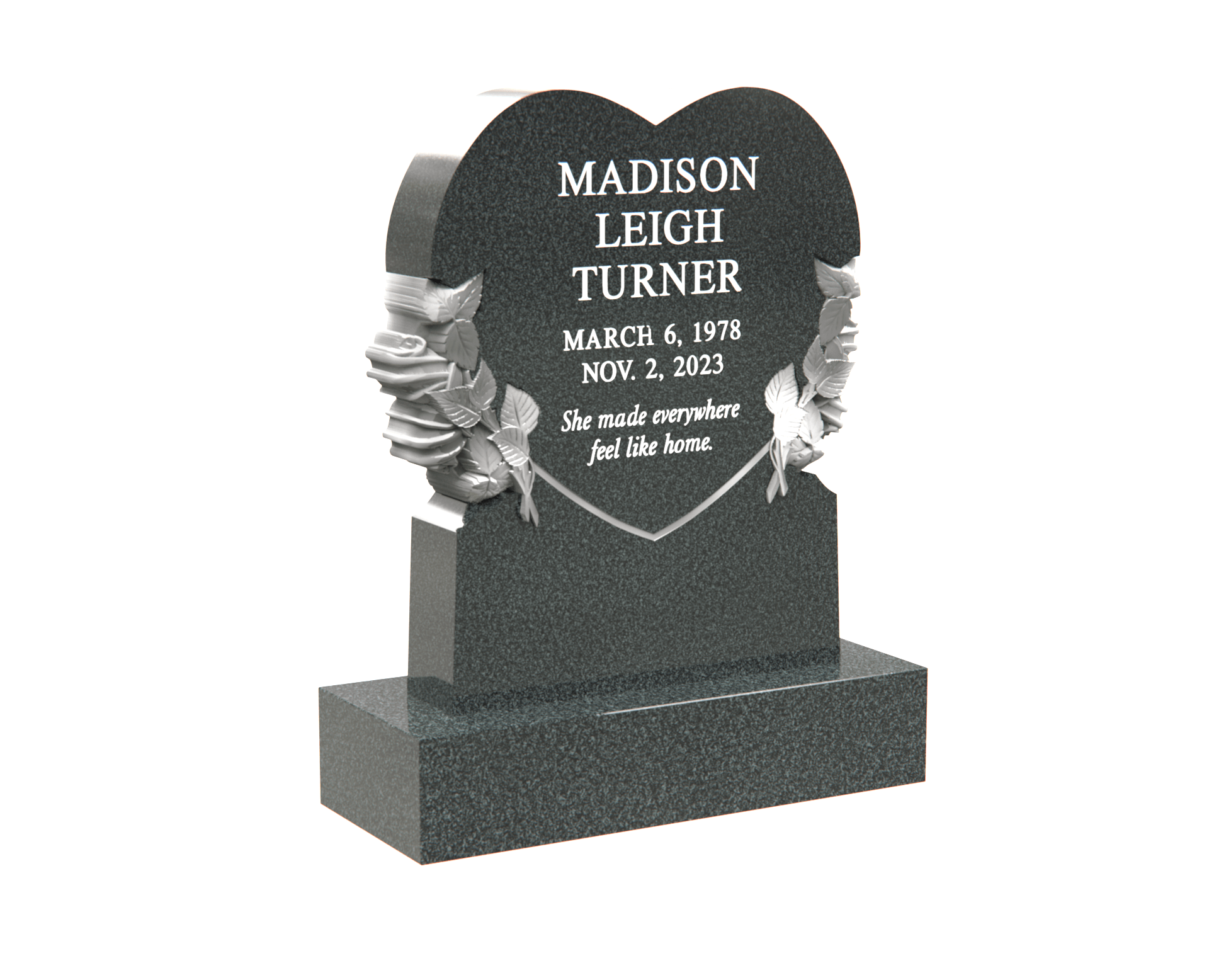 A beautifully designed heart-shaped memorial headstone adorned with delicate floral engravings, symbolizing love and remembrance. This elegant gravestone stands in a serene cemetery setting, providing a heartfelt tribute to the departed. The tranquil natural background enhances the atmosphere of reflection and peace.