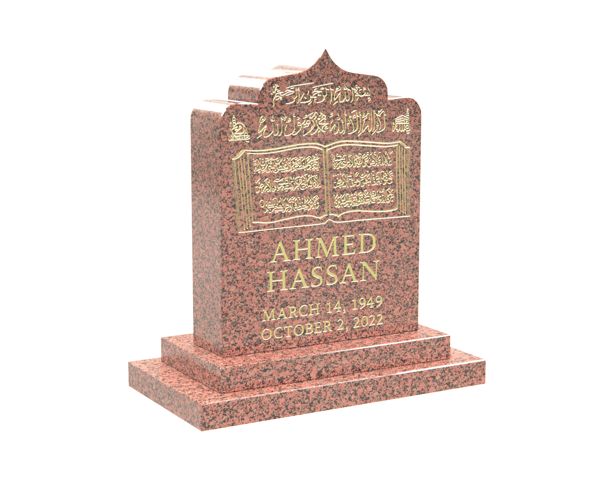 A beautifully crafted Islamic headstone featuring an engraved depiction of the Quran, symbolizing faith and devotion. The gravestone is set in a tranquil cemetery, providing a dignified and respectful resting place. The serene natural background enhances the solemn and spiritual ambiance.