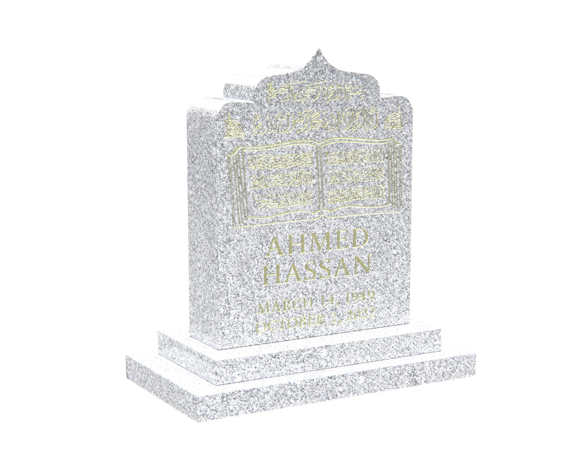 This upright Islamic headstone features a dignified tiered base and a graceful arch-shaped top, inspired by traditional mosque architecture. The polished tablet is engraved with Arabic script and an open Quran design, creating a meaningful Muslim grave marker that honors faith and remembrance. Sunblast lettering keeps the inscription clear and easy to read, while the solid granite construction offers long-lasting strength outdoors. A thoughtful, budget-friendly memorial choice for families seeking a simple yet elegant Islamic monument.