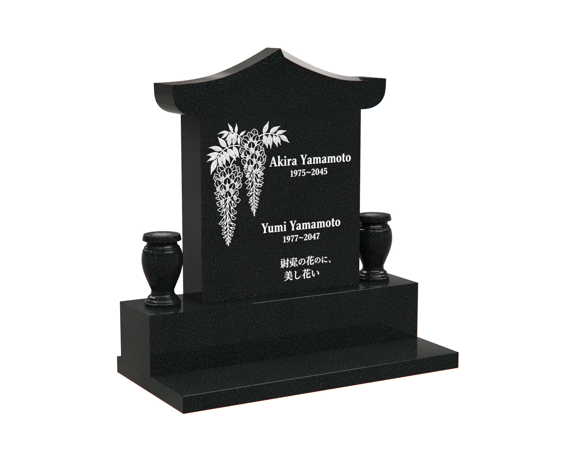 Elegant upright companion monument in polished granite with a pagoda-roof top, detailed wisteria engraving, and two matching flower vases. Ideal Asian/Japanese memorial with custom inscriptions and layout options.