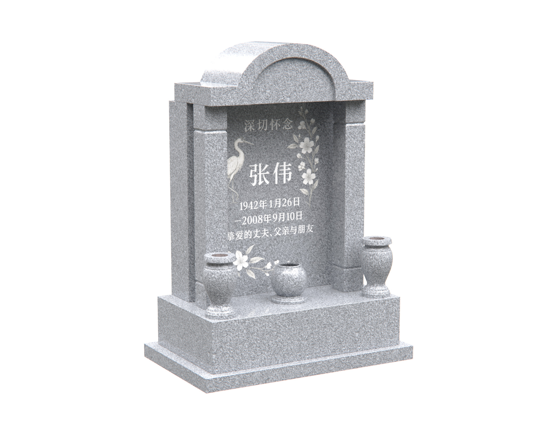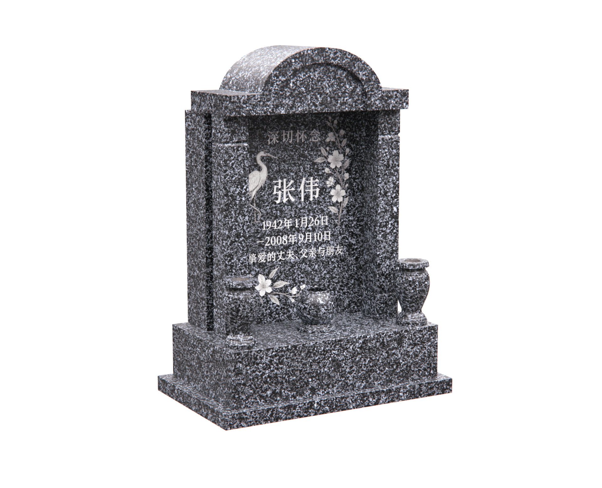 Crafted from durable granite, this upright memorial carries a sense of tradition and elegance. The crane symbolizes longevity and peace, while the flowers represent love and remembrance. A monument of respect and timeless beauty.